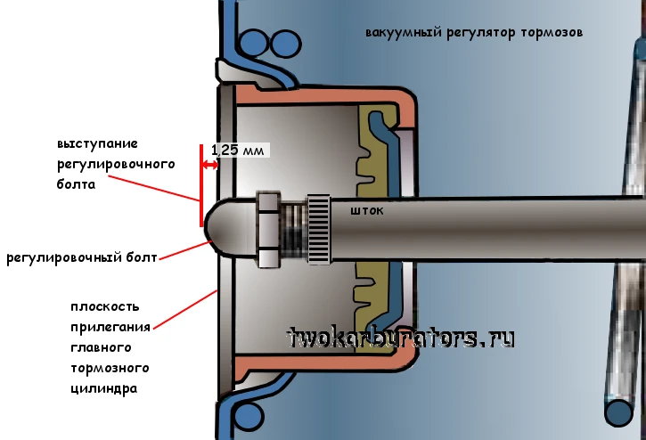 Почему возникает такая неисправность? Возможно в процессе ремонта (вакуумного усилителя тормозов или при замене главного тормозного цилиндра), кто-то слишком сильно вывернул регулировочный винт на штоке вакуумного усилителя. В идеале он должен выступать на 1,25 — 2,0 мм относительно плоскости прилегания главного тормозного цилиндра к корпусу вакуумного усилителя тормозов.