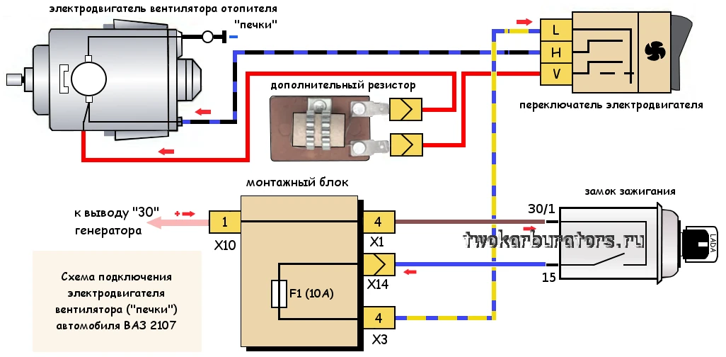 Электродвигатель вентилятора отопителя (печки) ВАЗ 2107 может подключаться к бортовой сети либо напрямую (это будет самая высокая вторая скорость его работы — 3000±150 об/мин), либо через дополнительный резистор имеющий спираль сопротивления (1,5 Ом). Тогда это будет малая скорость вращения вентилятора электродвигателя (2200 об/мин).