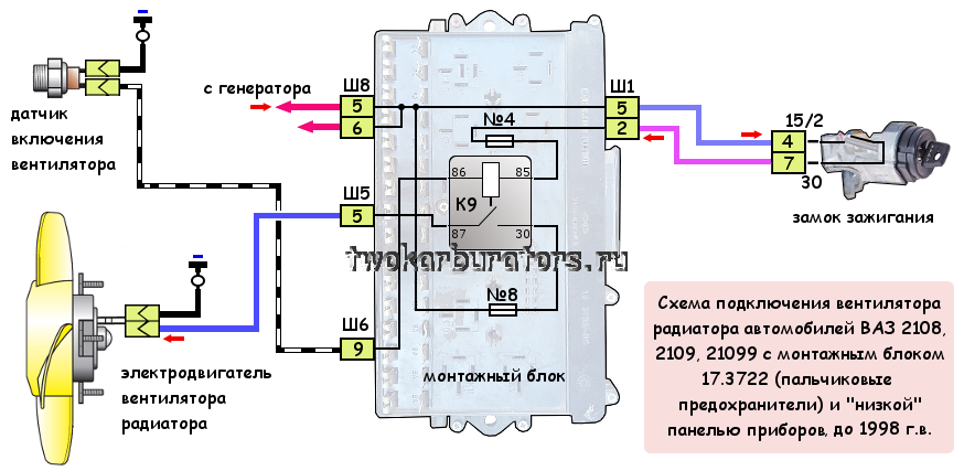 Подробности и описания схем см. «Схема включения вентилятора радиатора ВАЗ 2108, 2109, 21099».