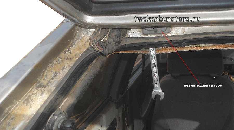Отворачиваем два болта крепления петли к задней двери.