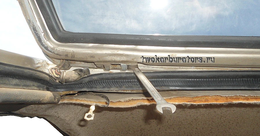 Немного отгибаем обивку потолка в месте крепления петель двери к кузову, предварительно сняв ее окантовку.