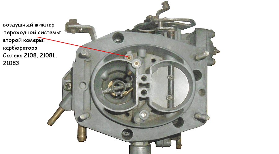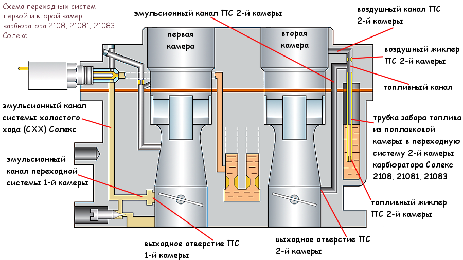 Предыдущее изображение Следующее изображение image1669 Схема переходных систем первой и второй камер карбюратора Солекс 2108, 21081, 21083