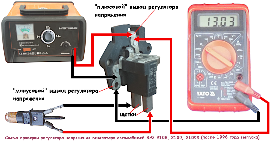 Проверка мультиметром положительных диодов выпрямительного блока генератора на «обрыв» (сопротивление несколько сотен Ом — ток проходит — диод исправен)