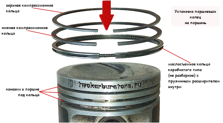 Для установки большими пальцами обеих рук слегка разводим в стороны края замка (разреза) каждого из колец. Потом насаживаем его на поршень и устанавливаем их каждое в свою канавку. Сначала маслосъемное (самое нижнее), потом нижнее компрессионное кольцо, потом верхнее компрессионное. См. «Особенности установки поршневых колец на поршень».