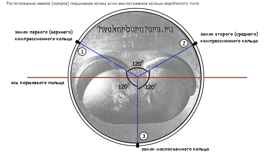Реальное расположение замков (зазоров) поршневых колец под углом 120 градусов, если маслосъемное кольцо коробчатого типа