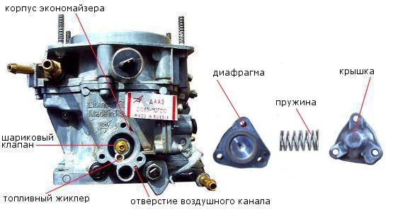 Возможные его неисправности это повреждение диафрагмы — ведет к отказу экономайзера и как следствие ухудшению мощности, повышению расхода топлива, засорение каналов и жиклеров — также ведет к отказу и падению мощности, не герметичность шарикового клапана — увеличивает расход топлива из-за подтекания из распылителя экономайзера.