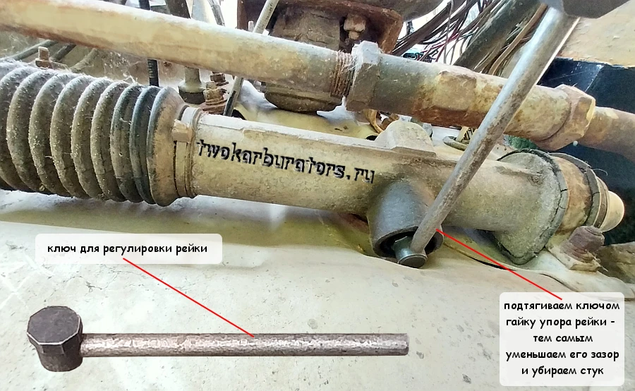 Аналогичным образом проверяется рулевая рейка — покачиванием рулевых тяг. При наличии люфта и стука можно попробовать подтянуть гайку рейки. Затягиваем ее до упора специальным ключом. А потом отворачиваем на пол-грани ключа.