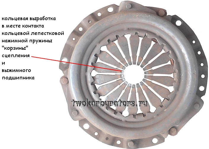Как следствие, в зоне контакта с выжимным подшипником на кольцевой лепестковой пружине «корзины», начнется усиленный износ. Через непродолжительное время «корзину» придется заменить.