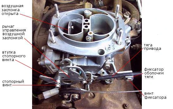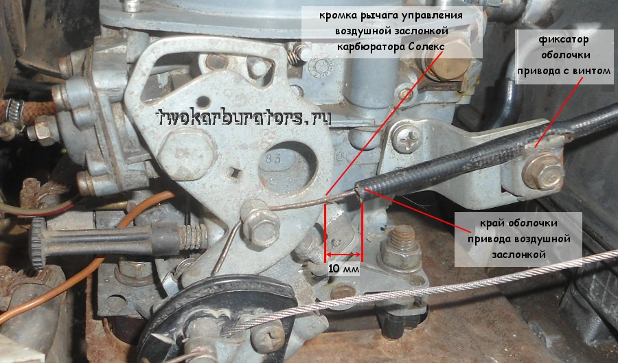 Для более четкой фиксации положения воздушной заслонки, можно после проведения регулировки ослабить крепление оболочки тяги и сместить ее (оболочку) на пару миллиметров в сторону рычага управления воздушной заслонкой. После чего ее крепление опять затянуть.
