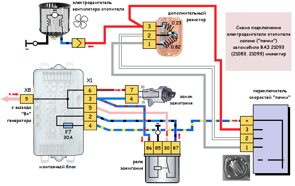 Схема подключения электродвигателя отопителя салона — печки автомобиля ВАЗ 21093 (21083, 21099) инжектор