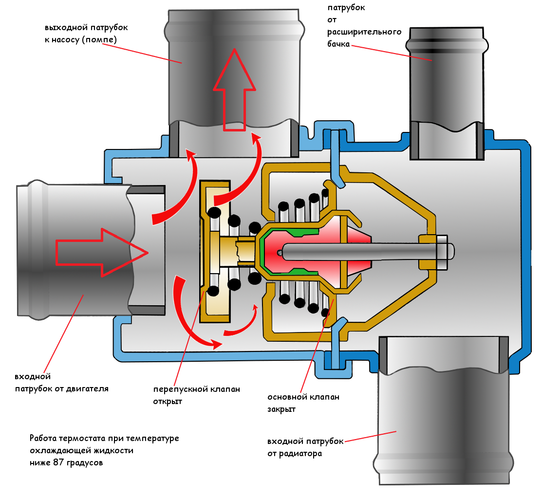 Перепускной и основной клапаны термостата открыты, ОЖ циркулирует как по малому, так и по большому кругу