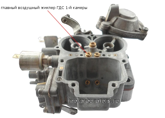 Доработка главной дозирующей системы первой камеры карбюратора заключается в небольшом обеднении проходящей через неё топливной смеси. Достигается это либо за счет увеличения объема воздуха, поступающего в смесь – увеличиваем размер воздушного жиклера первой камеры, либо за счет уменьшения подачи топлива в смесь – уменьшаем размер топливного жиклера первой камеры.