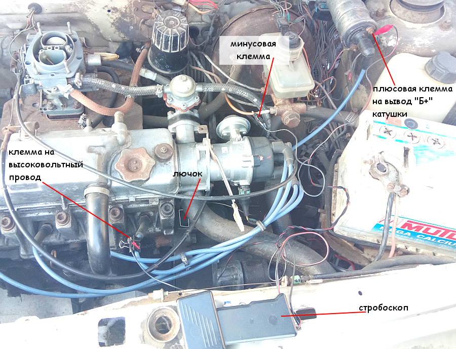 Подключение осуществляем по инструкции к вашему стробоскопу, так как модели их бывают разные и способы присоединения их могут различаться в деталях. В основном подключение стробоскопа выглядит так – красный провод к выводу «В» (+) катушки зажигания, черный к «минусу» АКБ, или любой детали корпуса, металлический зажим на высоковольтный провод четвертого цилиндра (ближнего к трамблеру).