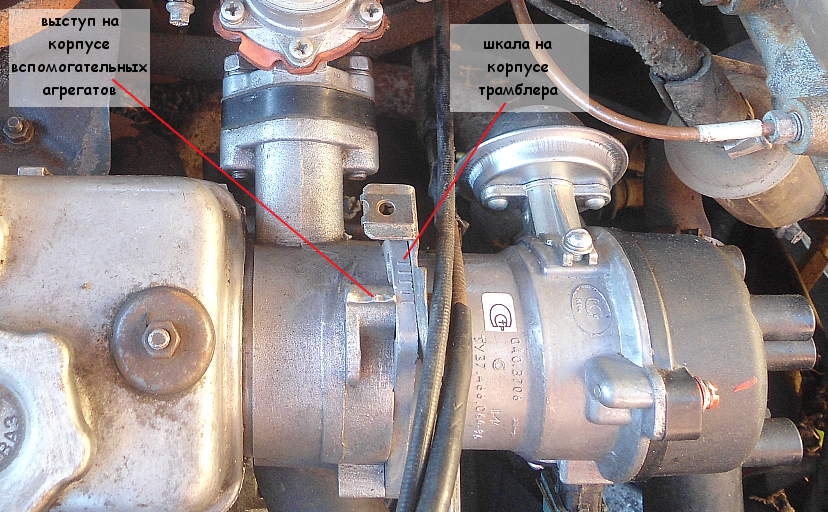 Понемногу вращаем трамблер чтобы метка в луче стробоскопа встала напротив нужного градуса на шкале.