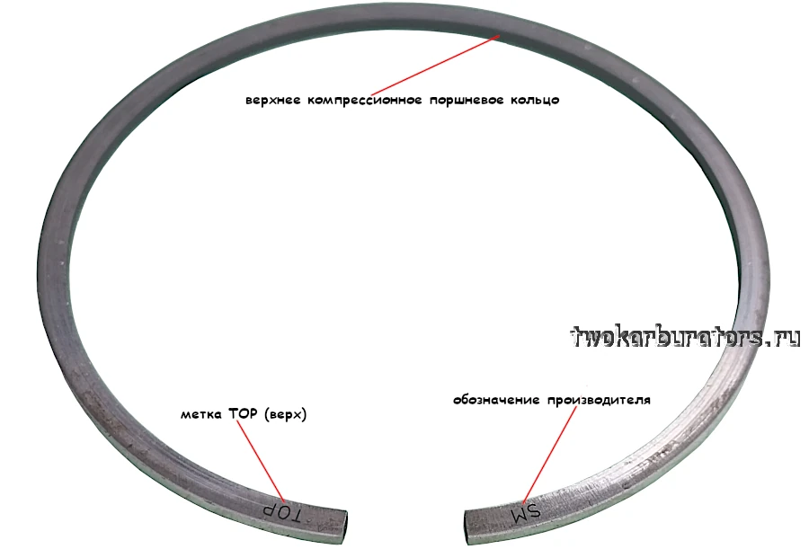 Несимметричная «бочка» становится симметричной уже в цилиндре двигателя при сжатии кольца. И так же способствует быстрой приработке кольца в цилиндре. Такое кольцо необходимо устанавливать в цилиндр только в одном положении. Меткой TOP (европейские кольца), либо лункой (американские кольца) вверх. Эта метка нанесена на верхнюю поверхность верхнего компрессионного кольца.
