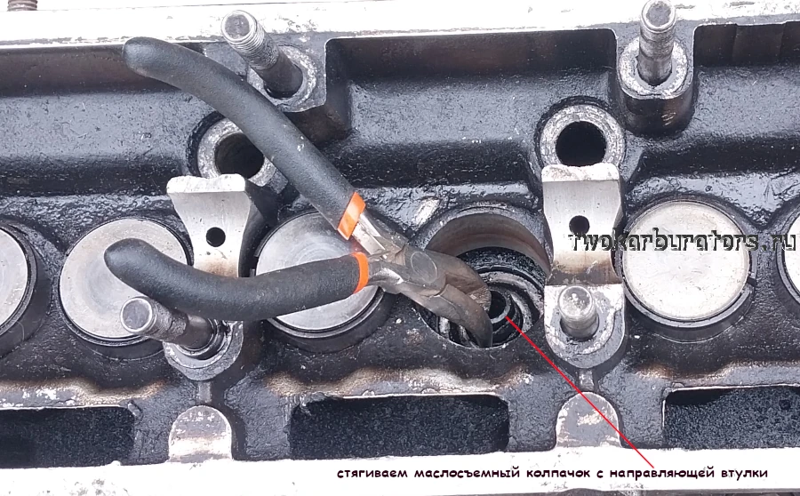Теперь прослабленный маслосъемный колпачок довольно свободно снимется с направляющей втулки при помощи пассатижей.