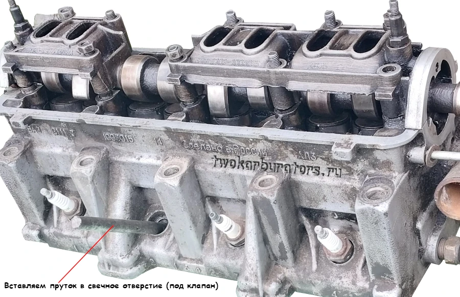 3. Через свечное отверстие первого цилиндра подставляем пруток под первый клапан.