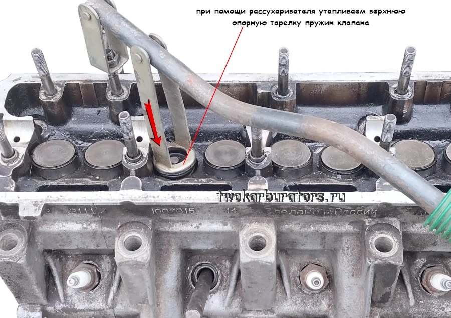 Устанавливаем рассухариватель упором на верхнюю опорную тарелку пружин клапана, а зацепом цепляем за шпильку корпуса распредвала (на нее нужно навернуть гайку). Давим на ручку рассухаривателя (можно резким движением), сжимая вниз пружины клапана.