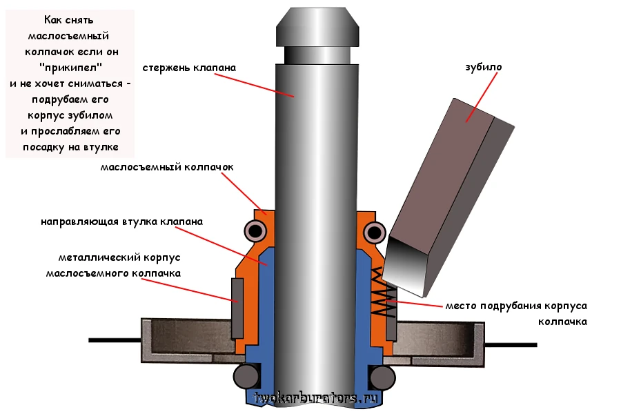 В случае если маслосъемный колпачок прикипел к направляющей втулке можно прослабить его посадку надрубив тонкостенный металлический корпус колпачка при помощи зубила.