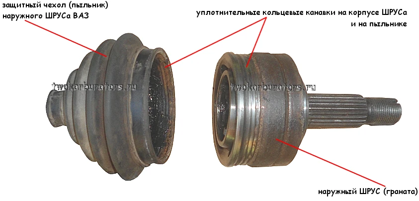 Поводом к замене пыльника наружного ШРУСа на автомобиле ВАЗ 2114, ВАЗ 2113 или ВАЗ 2115 может послужить обнаружение повреждения пыльника или в более запущенном случае появление хруста со стороны подвески при движении на небольшой скорости и одновременном повороте налево (направо). Это говорит о том, что герметичность пыльника нарушена (пыльник порван) и вовнутрь гранаты попадает грязь и вода вызывая износ контактирующих поверхностей шарнира.