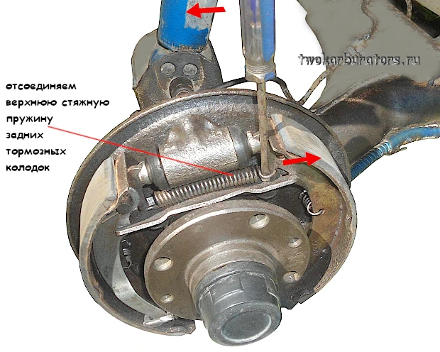 2. Отсоединяем верхнюю стяжную пружину задних тормозных колодок.