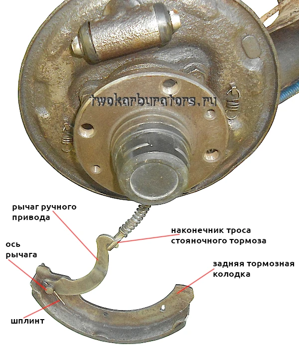При этом необходимо вывести из зацепления с рычагом ручного привода наконечник троса стояночного тормоза (рычаг закреплен на задней колодке).